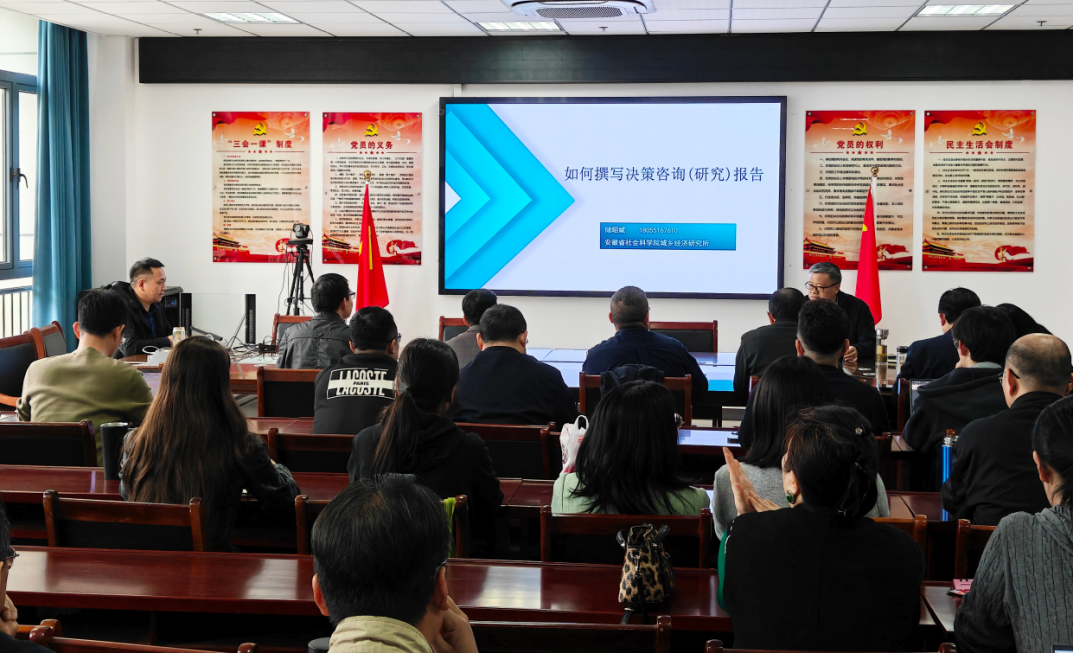 4月15日下午,安徽省社会科学院城乡经济研究所副所长储昭斌在K408会议室作题为“如何撰写决策咨询(研究)报告”的专题讲座。传媒学院全体专任教师及部分研究生参加聆听,传媒学院执行院长王业明主持讲座。