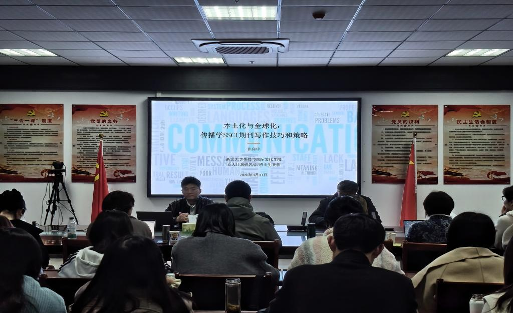 3月31日,浙江大学传媒与国际文化学院“百人计划”研究员、博士生导师张自中在传媒学院K408作题为“桥接本土化与全球化:传播学SSCI期刊写作技巧和策略”的专题学术讲座。传媒学院执行院长王业明主持讲座,学院部分中青年教师和2025级硕士研究生全体同学到场聆听。